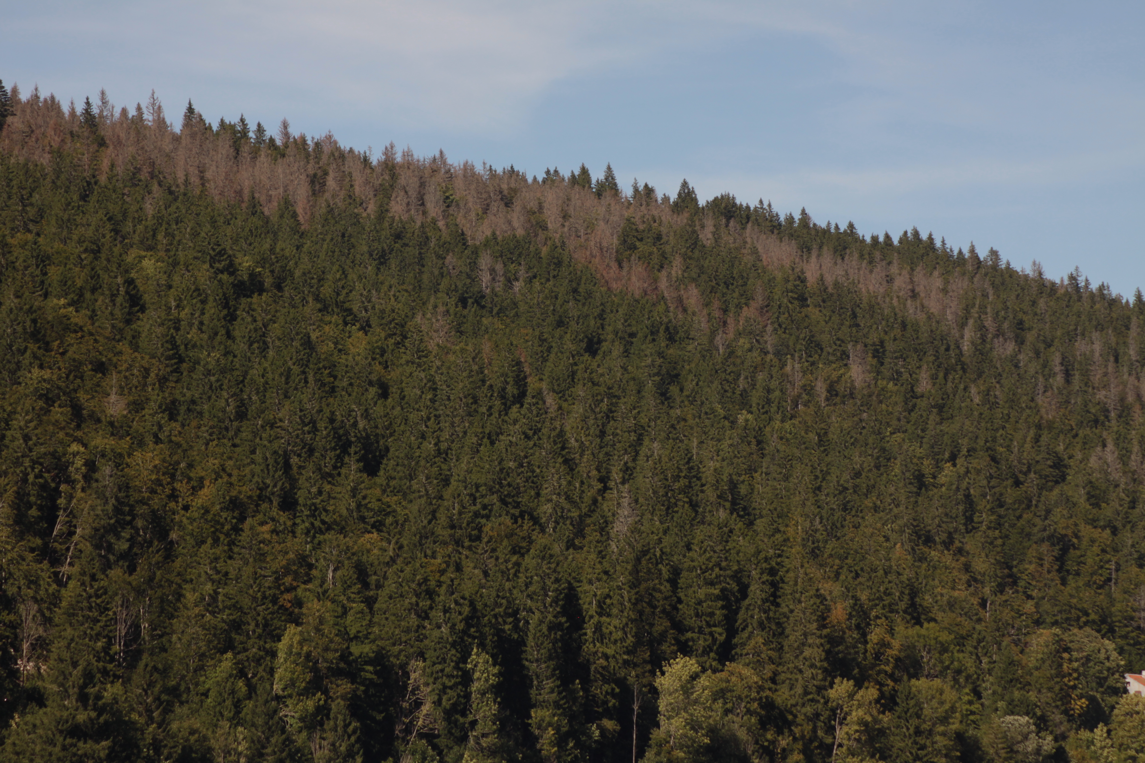 L'été fait de la résistance avec plus de 25°C au thermomètre. La forêt de résineux motre des signes de désèchessements avec de nombreux sapins totalement sec.